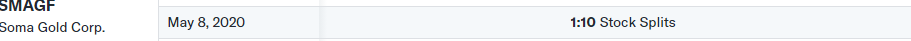 Thankfully, I donât use StockCharts.com otherwise I might rely on misleading charts and remiss about not buying shares at prices that never existed. Iâve been long Soma since well before 2020 and probably would have noticed if my position dropped by 99%. Comically, your illustrious charting service failed to incorporate the 1:10 stock split on May 8th for what looks like the better part of a month.