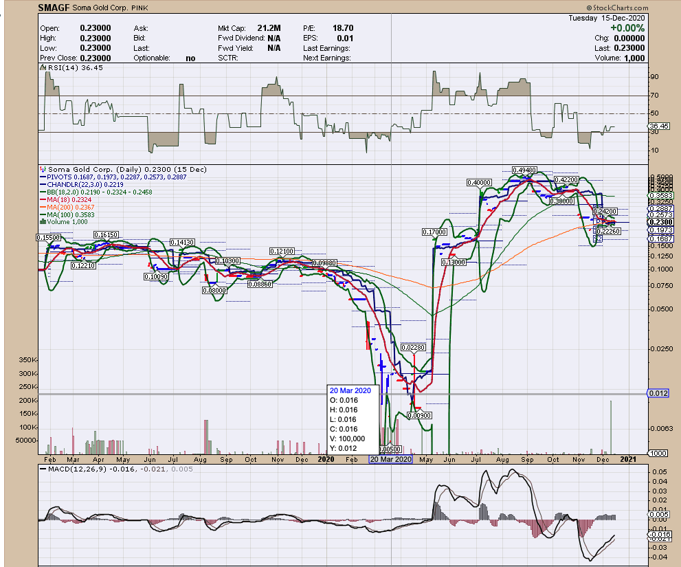 To be clear, nobody is always right but some folks are indeed almost always wrong. You brought up Soma in a misguided attempt to suggest that stocks with tight floats, like SOMA (and clearly AUMC) have the ability to go up 6000%. Unfortunately, this attempt hit a bit of a wall because you use a charting system that doesnât bother adjusting prices, post stock splits, on a real-time basis. On Soma, Iâm only up 40% because I bought as high as $1 and as low as 25 cents. but the latest doubling of the stock helped me into the green. Its not one of my favorite holdings. My best performer over the past year has been Spartan Resources. Even a blind squirrel finds a nut every once in awhile.