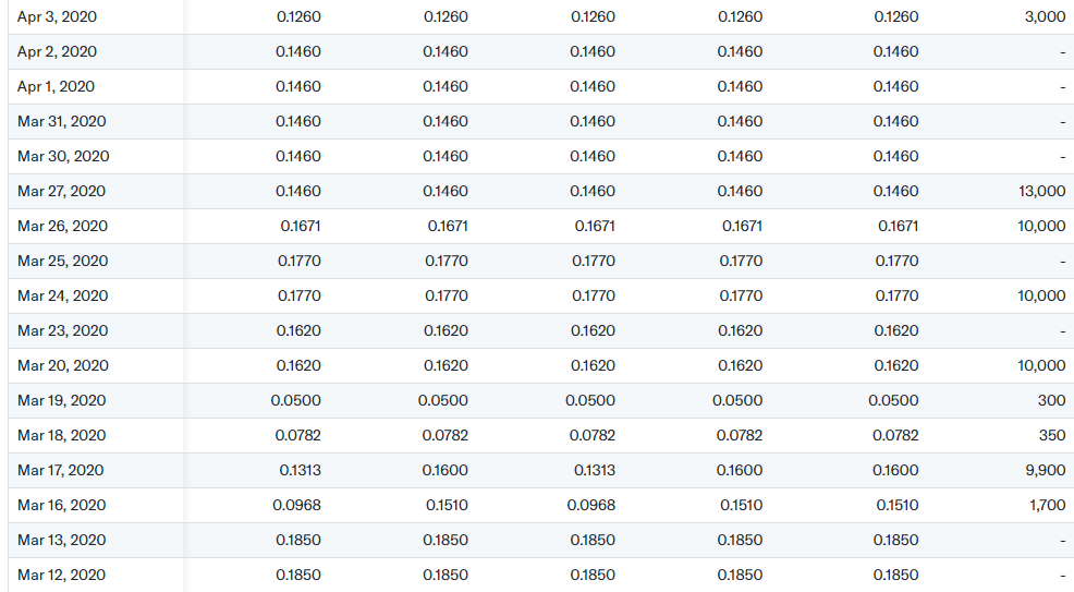 Youâre really going to make me do this? Hereâs the daily high/low/volume for the period. The stock traded 300 shares at 5 cents on March 9th (obviously a $150 âblipâ as it traded at 17 cents the day after) over the EXACT period you are referencing. This was the low, if you can call it that. The .005 never happened. Nobody, and I do mean nobody, follows the US tracking vehicles for Canadian listed stocks for technical nor fundamental analysis for this reason.