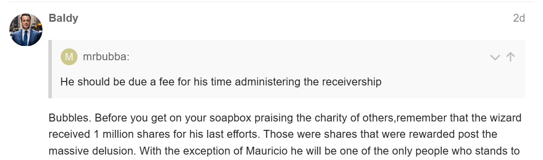 And wizard will be incentivized to be as efficient as possible in his capacity as receiver to keep those shares worthwhile! Much better with his company knowledge and general smarts than being assigned some random fiduciary.