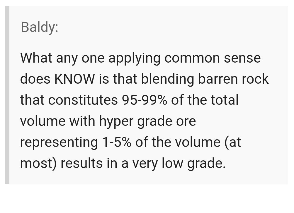 I NEVER argued that only standard mining operations could be profitable but rather that the decision to not pursue a resource/mine plan wasn’t a sound strategy. Given the past ten years of imminent production, false starts, failed financing, etc, etc this argument, not surpisingly, turned out to be factual. Empiricallly. Ironically, Maurizio could have avoided a mountain of debt and a lot of opportunity cost if he made the decision to build a plant from the onset. They didn’t have a resource or mine plan back then and they don’t have a resource or mine plan now. As Mgold astutely points out in his recent post, there was a large stockpile of something back then and there’s that same stockpile, along with a small quantum of incremental tonnage from “finding the vein”, there now. The writing was on the wall after the Caren issues. Water under the bridge at this point.