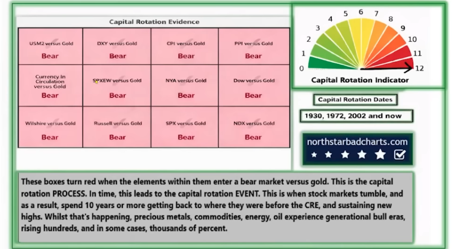 As those investors making phenomenal profits sell off and redeploy cash it is moved prominently into the commodity sector. This includes all commodities, but special focus is on gold, silver, and the PM miners. Some analysts suggest the current rotation could escalate into a “super capital rotation,” where a significant amount of capital shifts from stocks to hard assets like gold and silver, especially if the stock market experiences a severe bear market. Commodities, especially the precious metal miners, are ascending into a very noticeable long trend Secular Bull Market at the present point in time. Michael Oliver, The Northstar and Bad Charts guys, Kevin Wadsworth and Patrick Karim make the case: