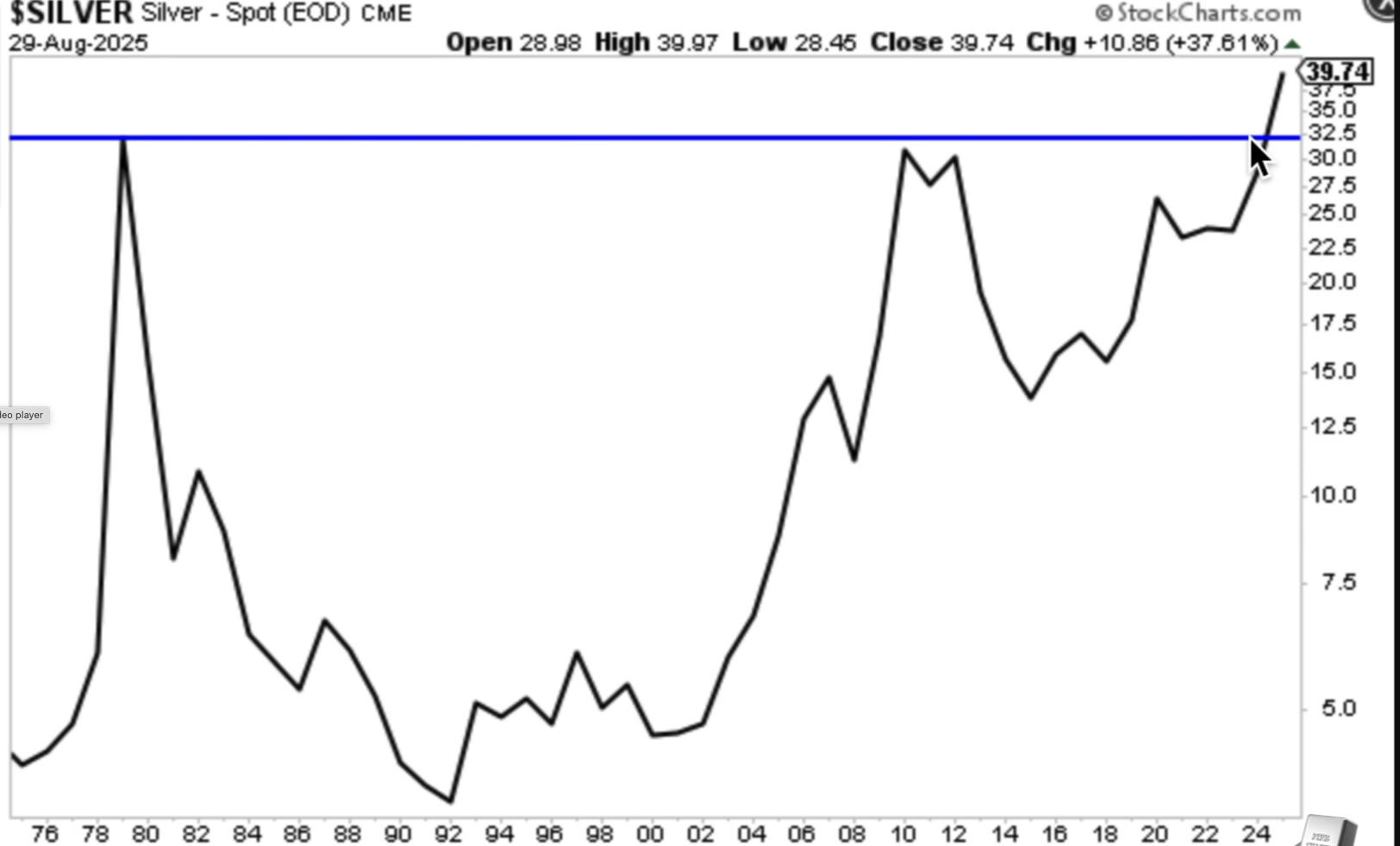 Michael presents a very important narrative above in explaining each of his charts. Important to hear all of what he has to say as he walks through each sector. In the line graph below, silver is close to closing at an annual 45 year high for 2025. (It has since closed end of year 2025 at ATH)