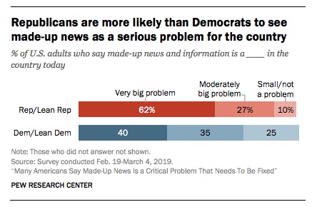 Pew finds a significant gap between Democrats’ and Republicans’ views on the seriousness of the problem with made-up news, though: