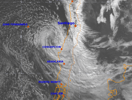 Looks like a front with a cold swirl of clouds out in the ocean that will hit the mountain later today. 50 knot winds should be blowing around the snow shortly. The webcam in the nearby Andes shows the storm: http://snowforecast.com/world-forecasts/around-the-world/south-america/valle-nevado/