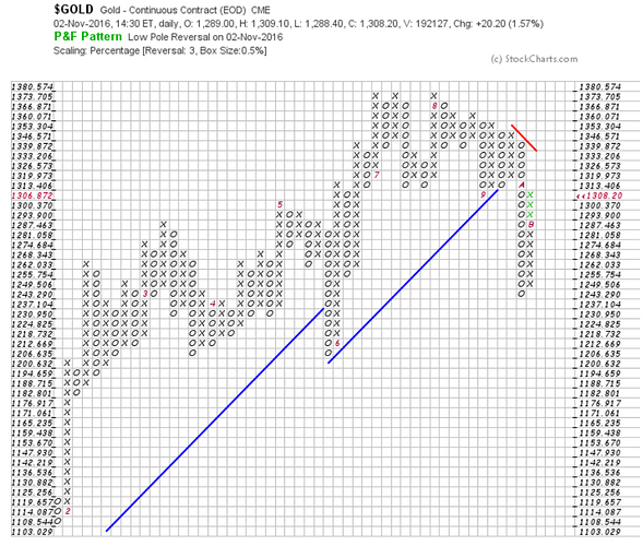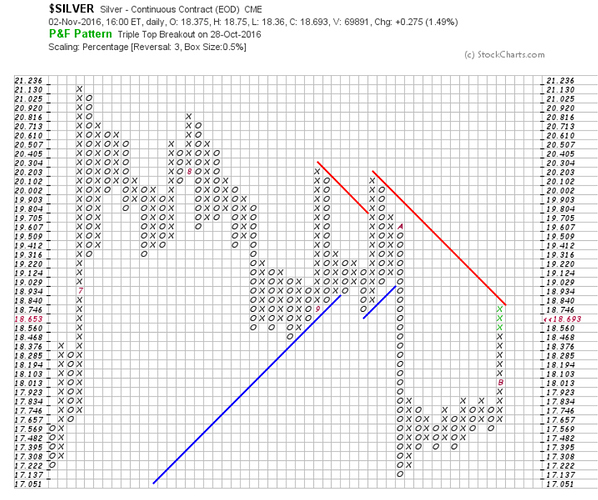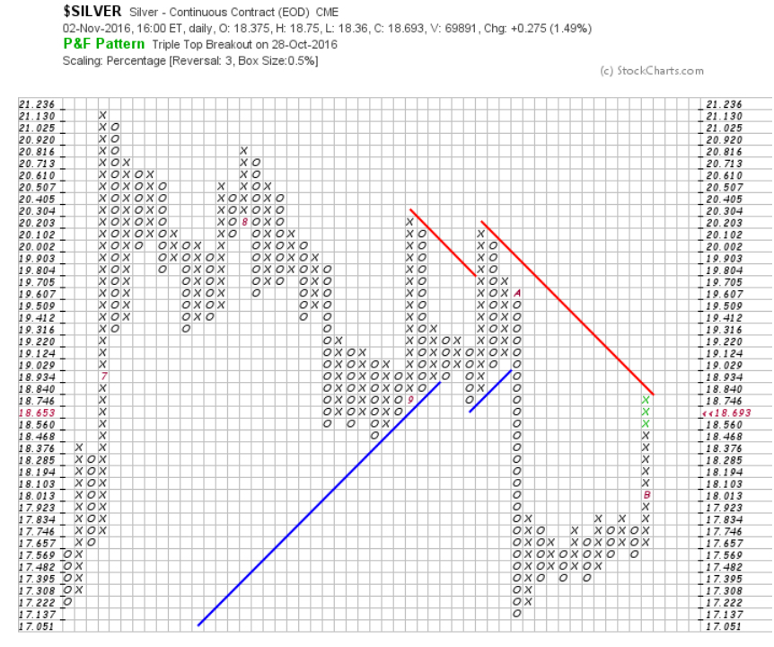 Addendum to the above post. Short term moves are great opportunities for traders. For longer term investments, some like to use P&F charts to determine trends, especially reversals. Generally, P&F chart users are looking for trend confirmations. To me, it looks like we may have a while to wait before trend reversals for the PMs are confirmed. P&F charts do not show timelines shown on most traditional charts. On the below charts, I have changed the standard scale of price movement to .5%. Hoping you may find the following useful, if not just interesting. For anyone interested, there is a lot of information concerning use of P&F charts shown here: Introduction to Point & Figure Charts [ChartSchool]