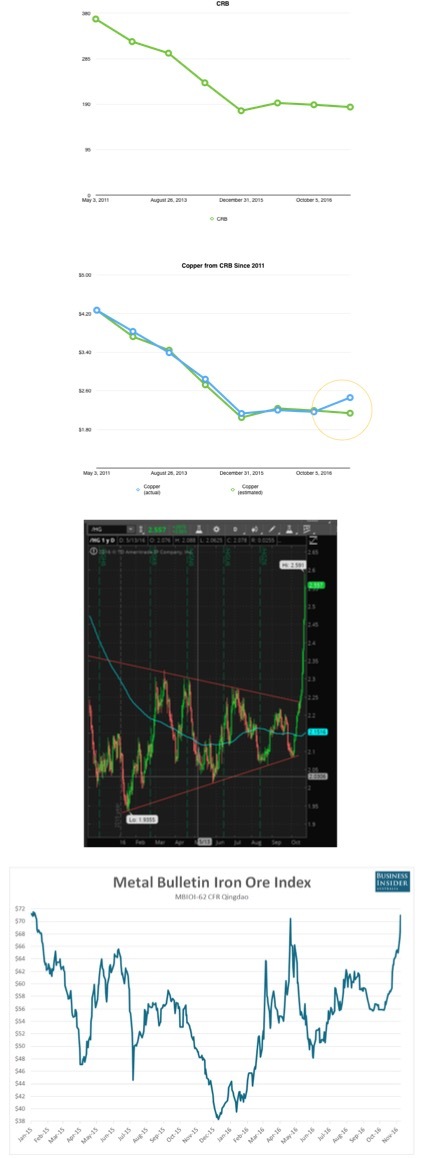 Could this be type of anticipation of a Trump victory and his promised $1T deficit financed spend on ‘infrastructure’? This approach is very similar to what China has been doing since 2008 and has been returning to in 2016. Yes, could be. Anticipation or not, the idea of fiscal (deficit) spending for infrastructure looks like it will go mainstream now that the U.S. is likely to proceed. This could put a big lift under commodity prices as everyone tries to stimulate their way out of the post-Great Recession blues. As China has shown however, there are only so many government built bridges to nowhere and ghost cities you can build and only so many real jobs results. But this could be another 4 or 5 year ‘phase’ in this ongoing crisis. It looks great at the beginning, all that shiny new stuff, but eventually the bill comes due.