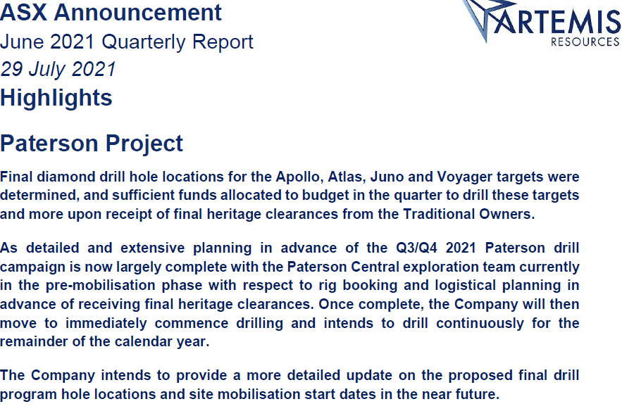 The Company has recently entered into an agreement with Roy Hill Holdings Pty Ltd (“ Roy Hill ”), allowing access to its flights to the Ginbata airstrip around 100 km south of the Nullagine Gold Project. This will result in significant operational cost savings and substantially reduced travel time and travel risk exposure for the Company’s employees. It also allows for more effective handover logistics between crews as they transition between rosters. The Company thanks Roy Hill for its efficient commercial engagement in this area for mutual benefit.