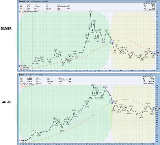 The monthly close was yesterday. Both gold and silver are right at their 48 month MA (4 year MA). As you can see, the POG and POS only occasionally cross this long time scale average. Both are right at the boundary threatening to move higher.