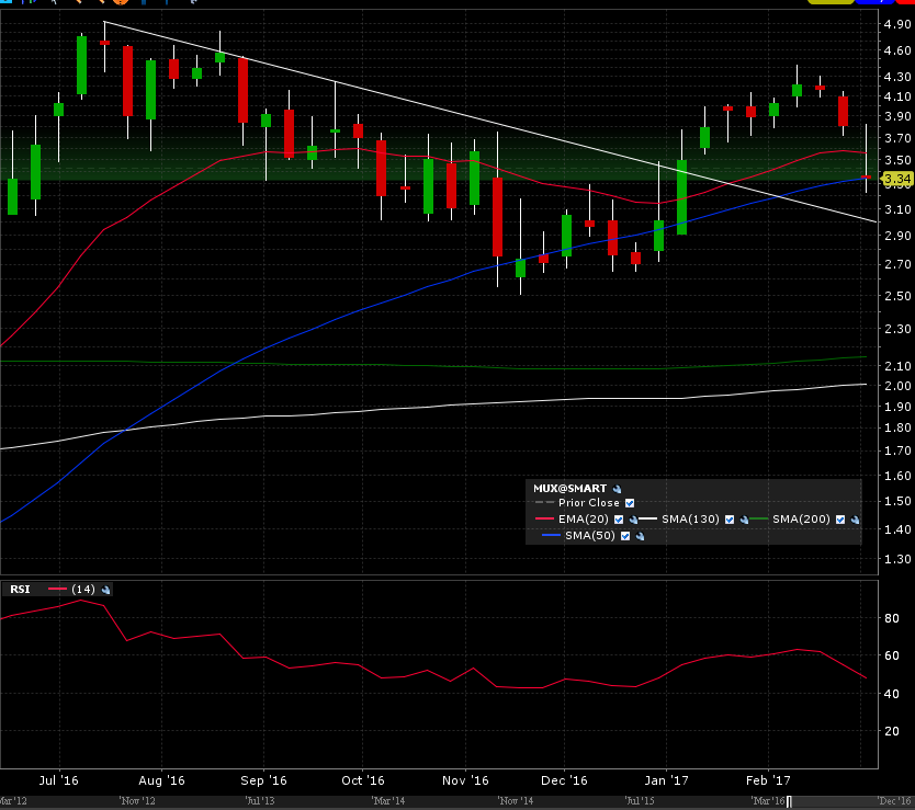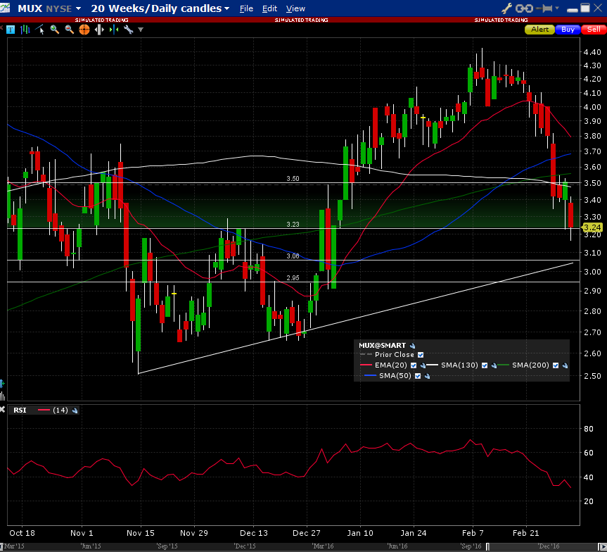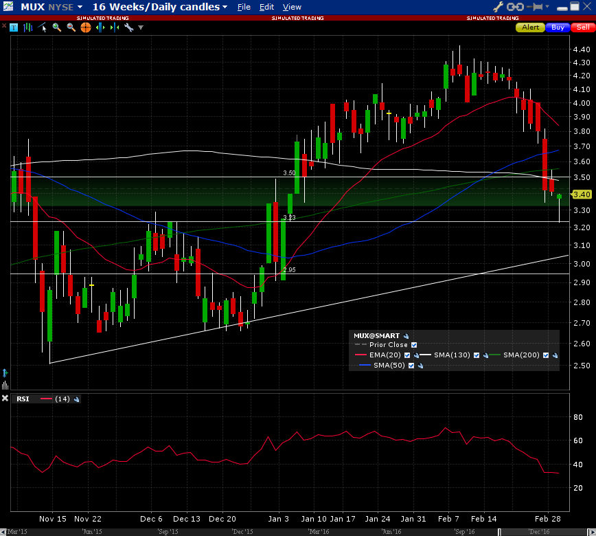 MUX chart is looking ugly right now. They have a conference calll tomorrow to discuss financial results for 2016 and project developments.