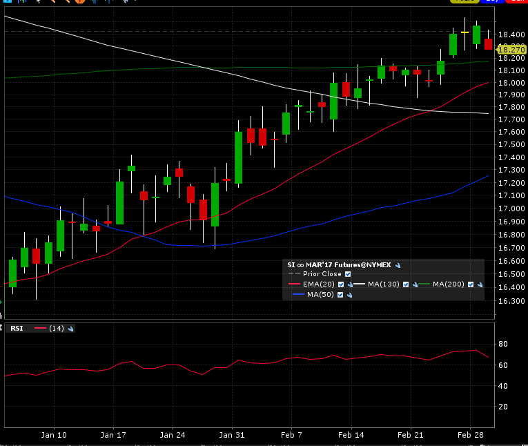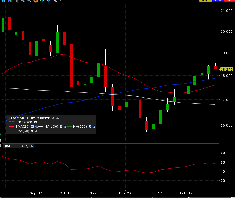 Here’s my simple daily interval chart for silver. Simply put, we’re looking for a test of the 200 moving avg. here which is the green line just below 18.20. The red 20 exponential moving average is sloping upward nicely and right at $18.