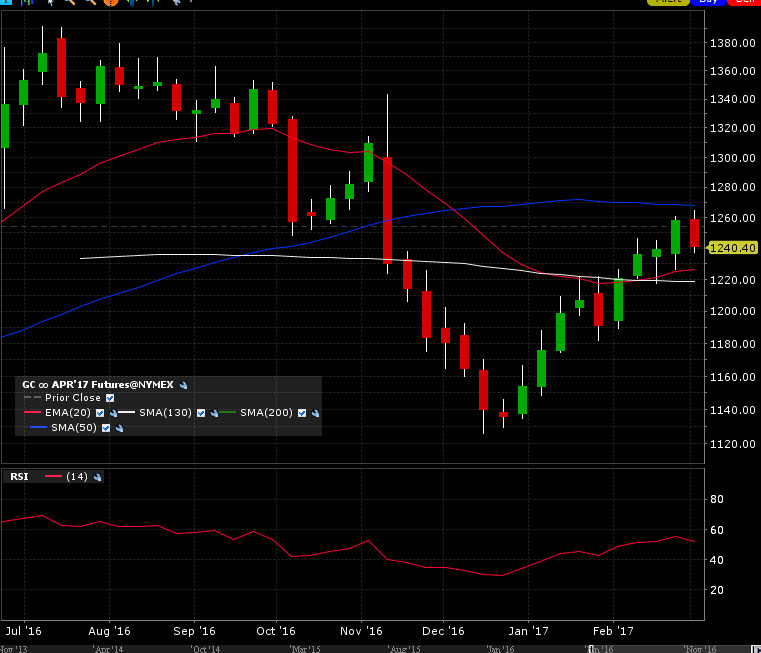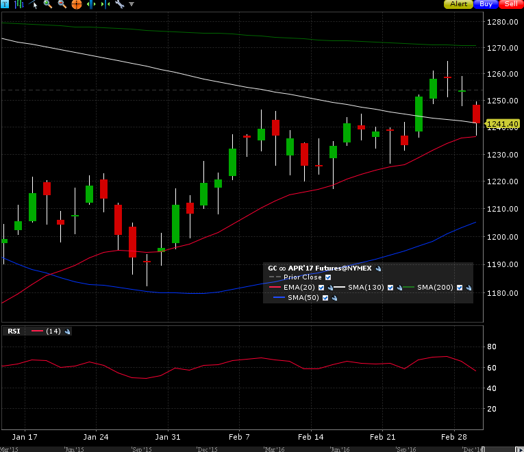 On the daily interval chart, gold so far pulled back to exactly test the red 20 EMA at 1237.20 and has moved thus far today back up to the white 130 MA at 1241.60. The close today and for these next couple weeks on this chart will be revealing in regards to the strength of gold.