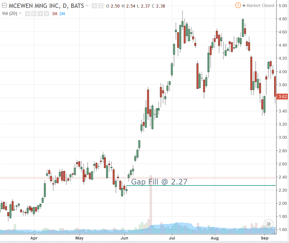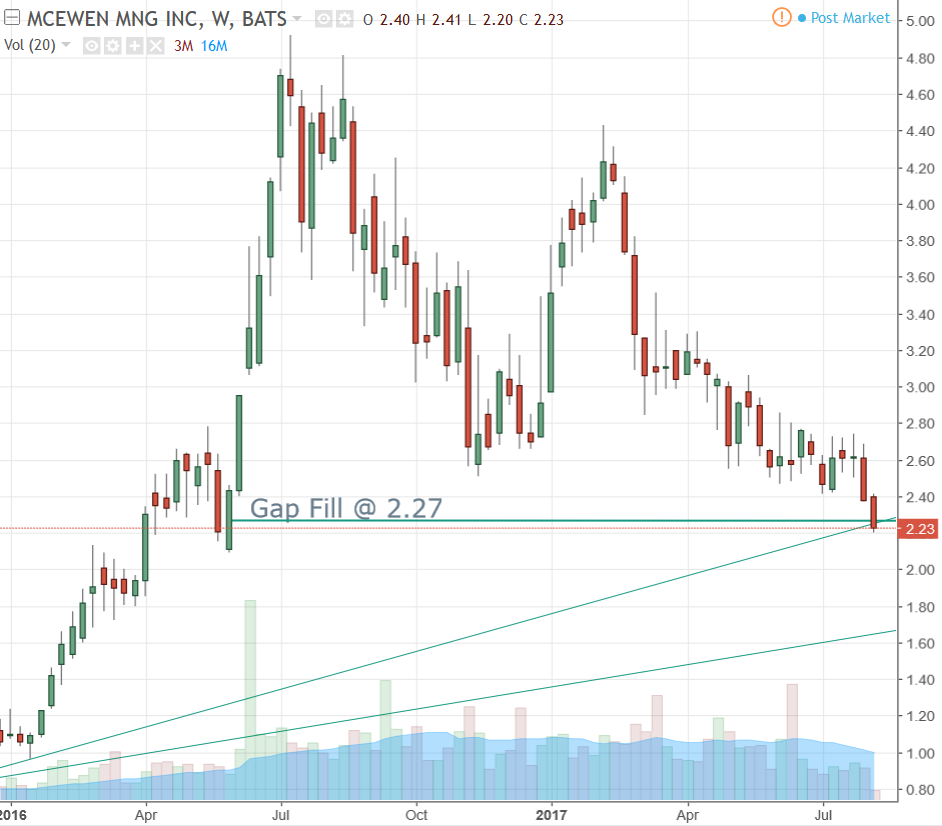 The second chart is a daily interval showing a gap that was formed on June 3, 2016. That gap will be filled if MUX hits 2.27. Watch that area for support, as well as the major swing low @ 2.09 that was hit a couple days prior to the day the gap was formed.