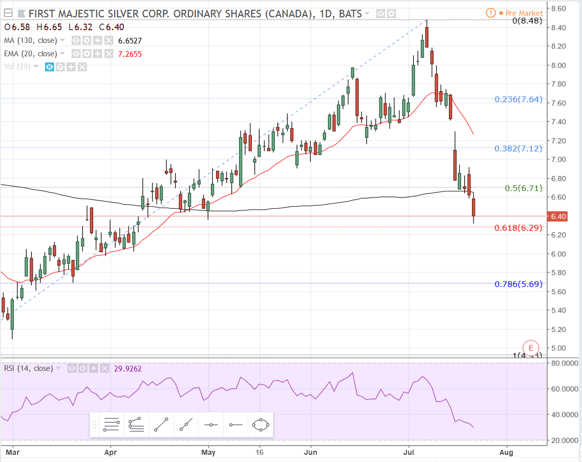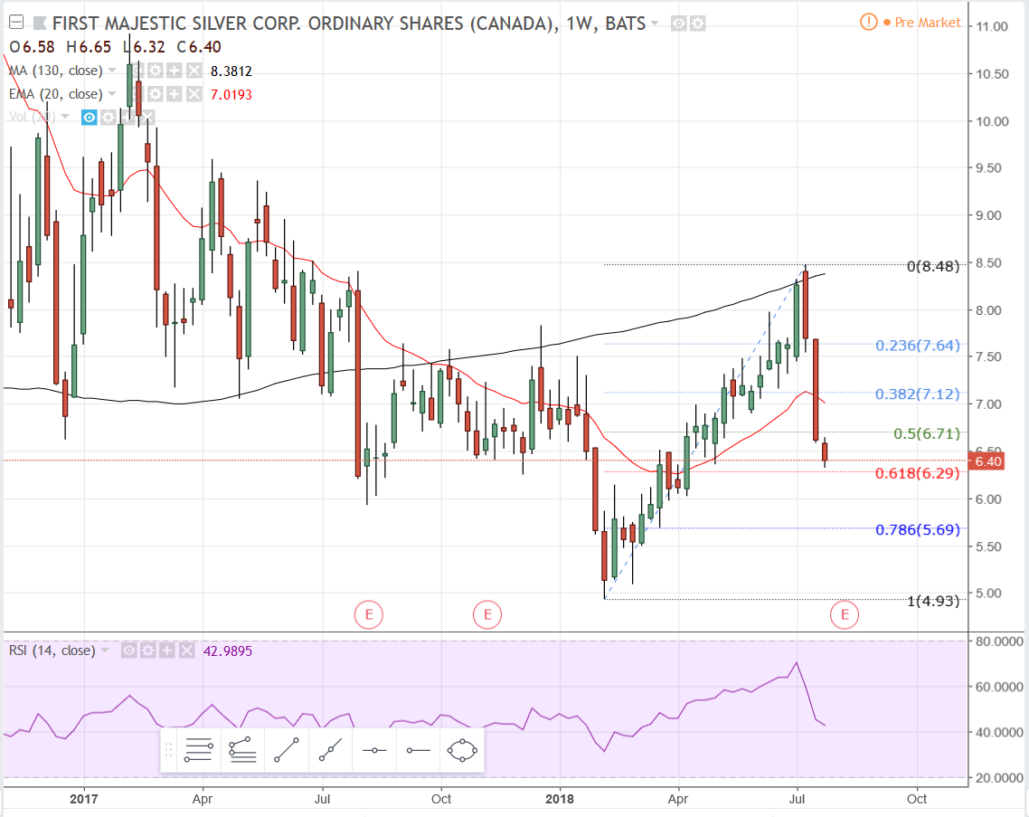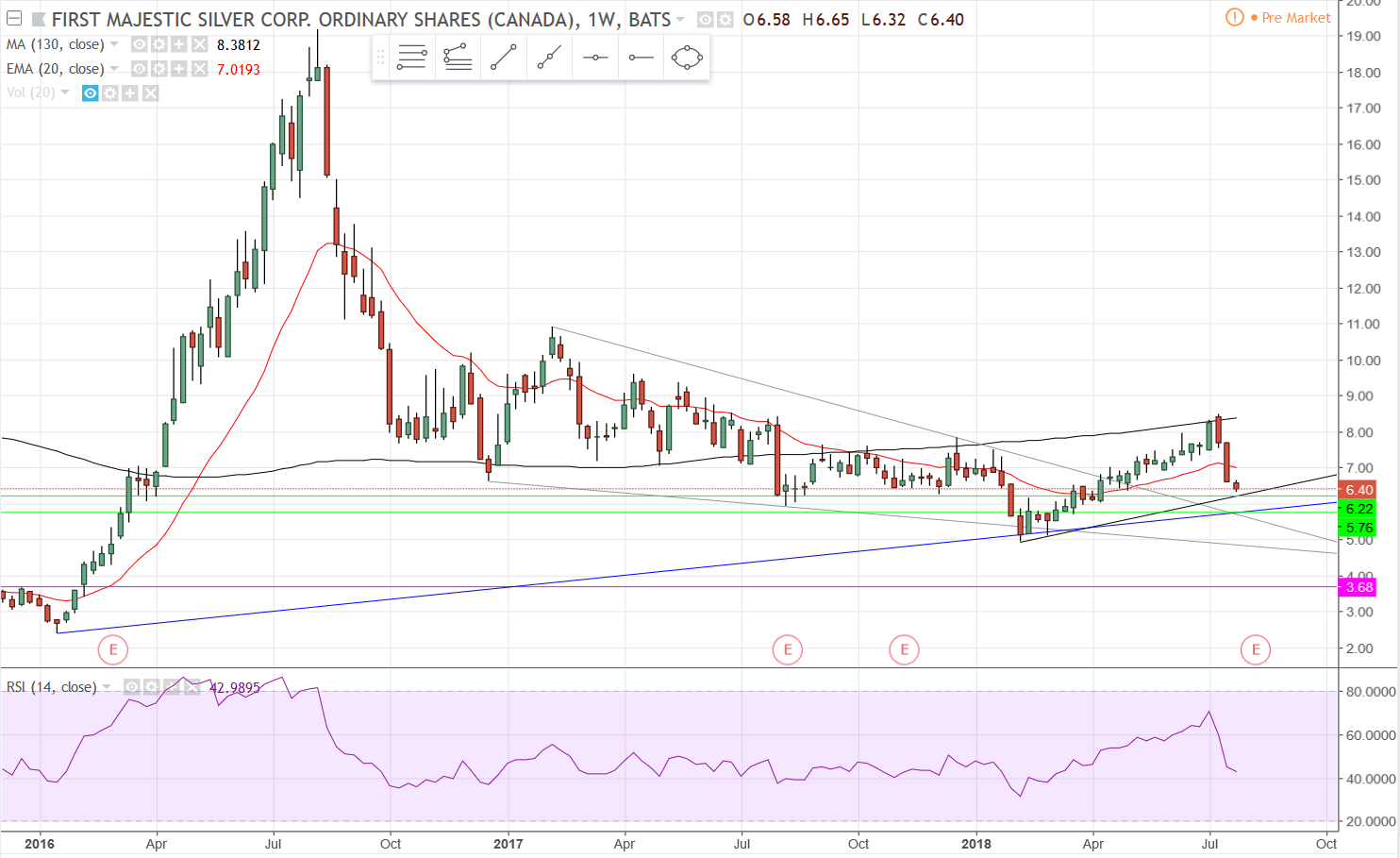 On the weekly chart, the stock is in a strong support area right now, from 6.40 to 5.90. If it goes further and loses 5.90 then it’s likely going to 5.50. If that doesn’t hold then you’re headed to $5. The way this stock is dropping I wouldn’t be surprised at all to see $5. If it doesn’t find support there then the next little area of support lies between $4.65 - 4.30. After that you’ve got a gap to fill at 3.68 and better support around $3.50. Those are the major support areas I can see.