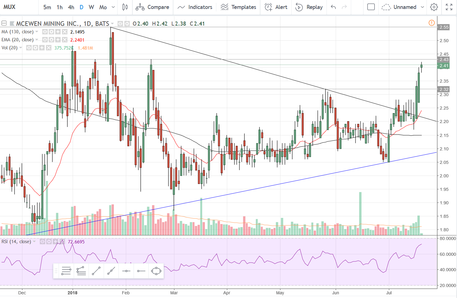 Here’s the daily interval. MUX has broken through the 2.32 resistance area on nice volume and is just under the next resistance level at 2.43. The RSI is in overbought territory so it wouldn’t shock me to see a bit of consolidation/retracement here.