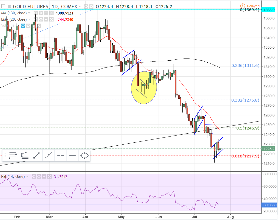 I brought up “bear flags” in the last post and thought I’d use the gold chart to provide a little more education. Bear flags are flags that form after an impulse move, or strong move, down. Bull flags are the exact opposite. I have outlined 5 bear flags on the gold chart. Each pair of blue lines roughly outlines a bear flag formation and you can see what happens each time.