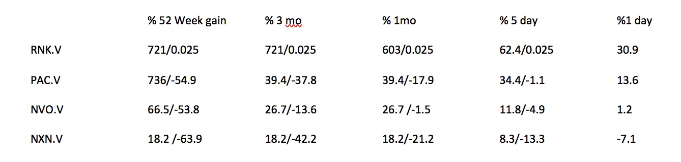 The Pilbara Conglomerate group is quite interesting in this respect. Originally on Aug 1 (post 788), I only showed the % change referenced from the period low. I should have also included the % change from the period high, since as a different reference point is chosen within the time frame a significantly different perspective can be appreciated. Below I show the Canadian traded companies as of Friday, Sept. 21.
