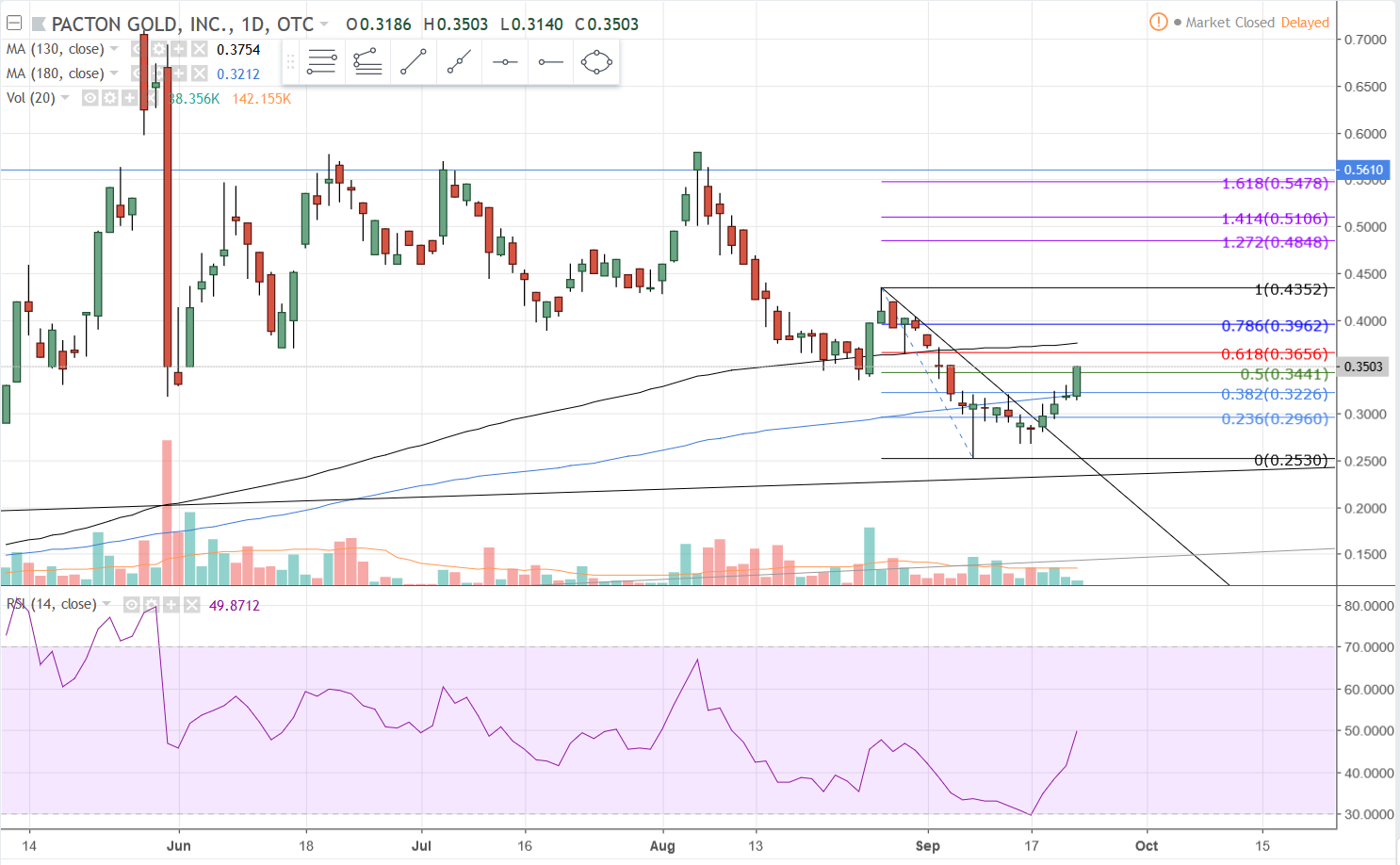 This one made what looks like a adam & eve bottom formation and, in the process, broke above a short term downtrend line. The breakout of the formation was also a break above the 180 MA. RSI is at 50 so you’re not near overbought. The 130 MA resistance is just above at .3754. Volume has been less than spectacular. Next week is easy… watch the 62% retracement level and the 130 MA for resistance. If you get a break above the 130 and a test of support there then watch for the test of resistance at the last swing high of .4352.