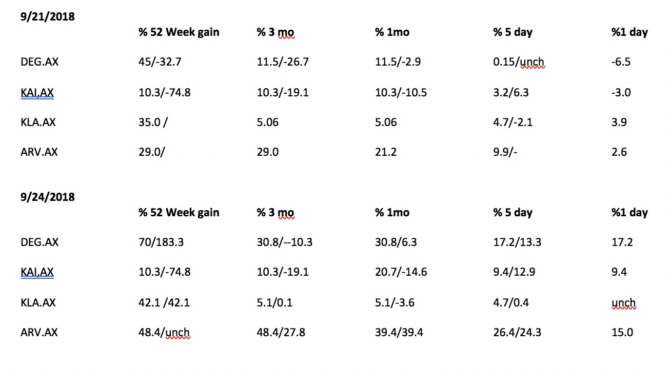 Post edited after Australian close by me - added ASX stocks FYI only (note: I did not complete analysis before market opened Sunday afternoon, I’m posting the partially completed % change as of the close on Friday 9/21/2018 - there are substantial changes over the weekend; tonight’s close is complete for each period as shown with date 9/24/2018 (may anticipate tomorrow’s movement IMO, unless there is news):